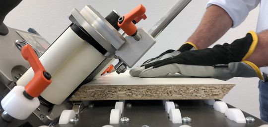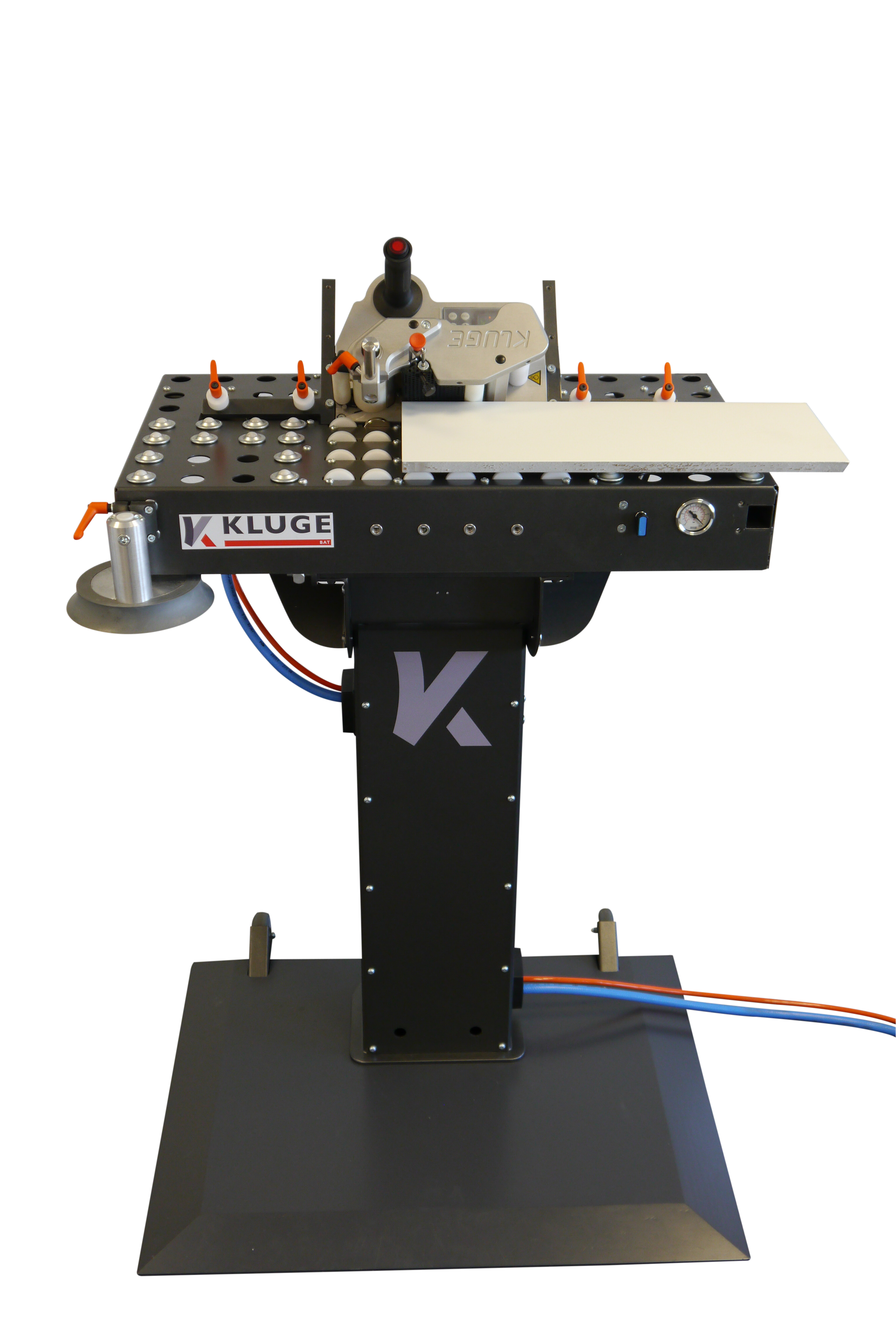 Die dazugehörigen 360° Kugelrollen sorgen für die variable Positionierung. Für ein angenehmes Handling bietet der BAT eine pneumatisch unterstützte Winkelverstellung zum Aufbringen von Kanten auf schrägen Schnittflächen bis 55° Neigung.